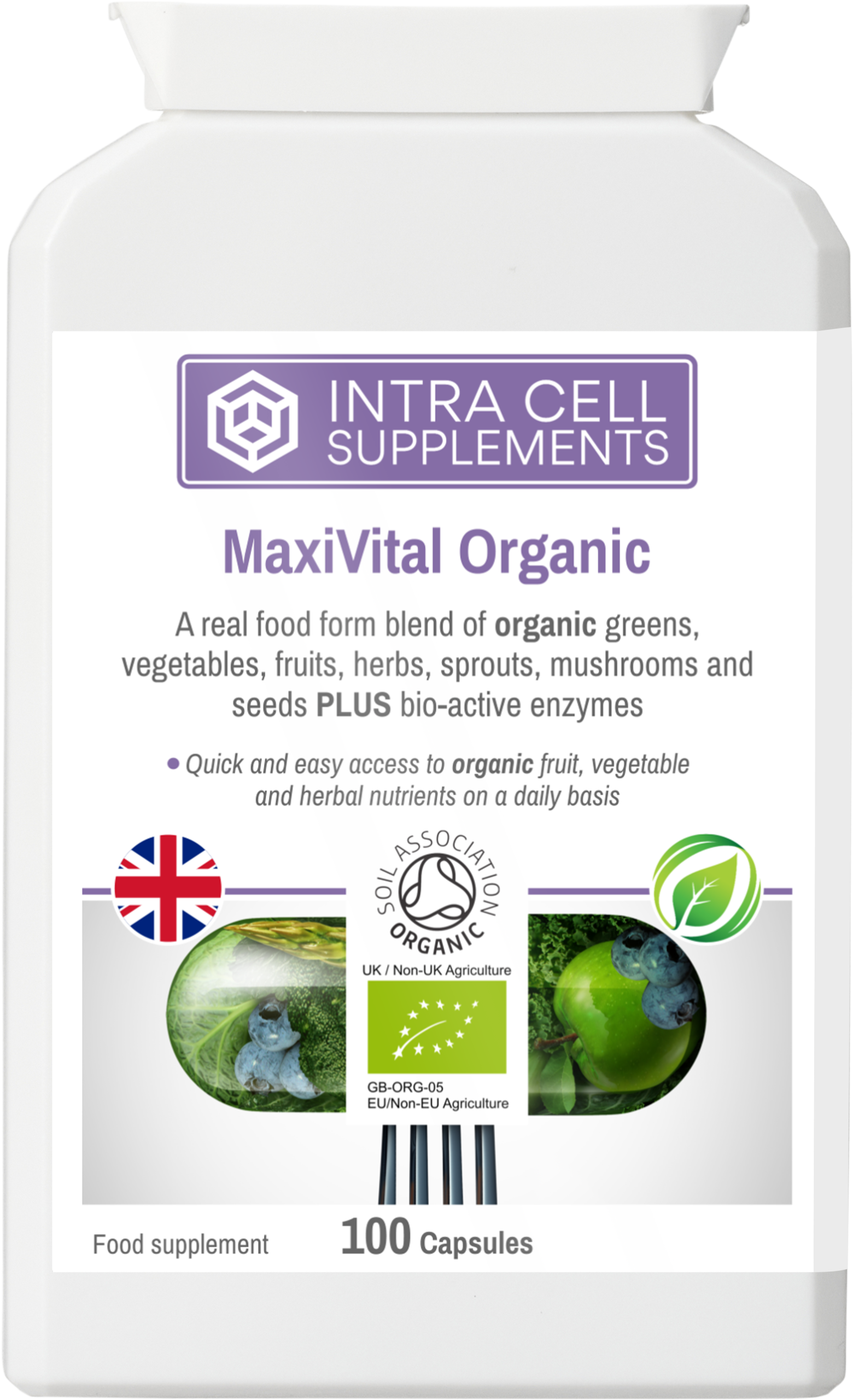 Organic greens, fruits, vegetables, mushrooms and seeds — Soil Association certified where applicable — in a convenient capsule format.